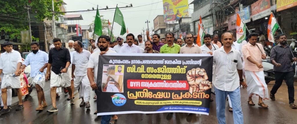 കുന്ദമംഗലം : ഗ്രാമ പഞ്ചായത്ത് പ്രസിഡന്റ് സി.വി സംജിത്തിന് നേരെയുള്ള ഡി.വൈ.എഫ്.ഐ അക്രമത്തിനെതിരെ കുന്ദമംഗലം പഞ്ചായത്ത് യു.ഡി. എഫ് കമ്മിറ്റി അഭിമുഖത്തിൽ കുന്ദമംഗലത്ത് പ്രതിഷേധ മാർച്ച് നടത്തി.
