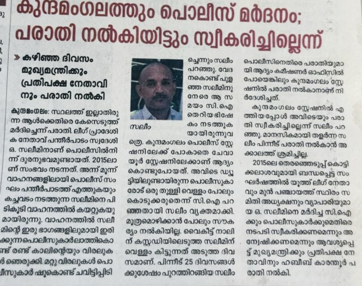 2015 ൽ യൂത്ത് ലീഗ് നേതാവ് ഒ. സലീമിനെ പോലീസ് മർദ്ധിച്ച സംഭവം: മുഖ്യമന്ത്രിക്കും പ്രതിപക്ഷ നേതാവിനും പരാതി നൽകി