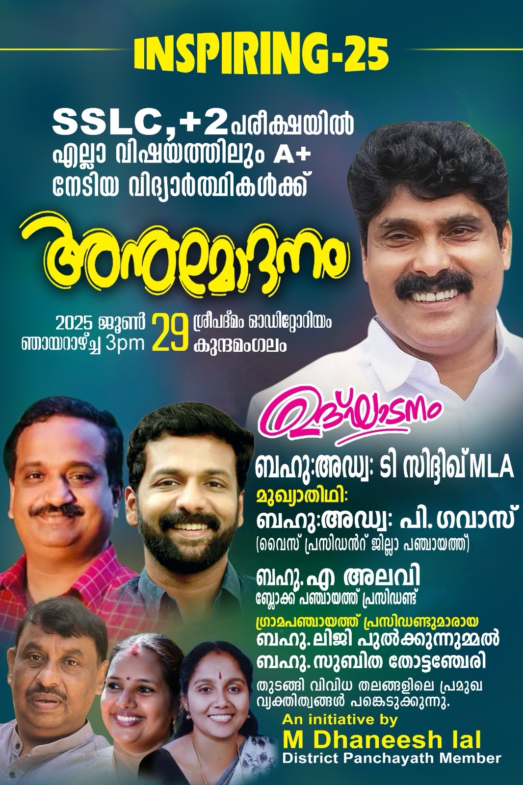 ജില്ലാ പഞ്ചായത്ത് കുന്ദമംഗലം ഡിവിഷനിൽ വർഷംതോറും നടത്തിവരാറുള്ള SSLC +2 പരീക്ഷയിൽ എല്ലാ വിഷയത്തിലും A+ നേടിയ വിദ്യാർത്ഥികളെ അനുമോദിക്കുന്ന ഇൻസ്പെയറിങ് പരിപാടി 29 ന്